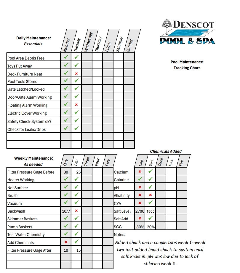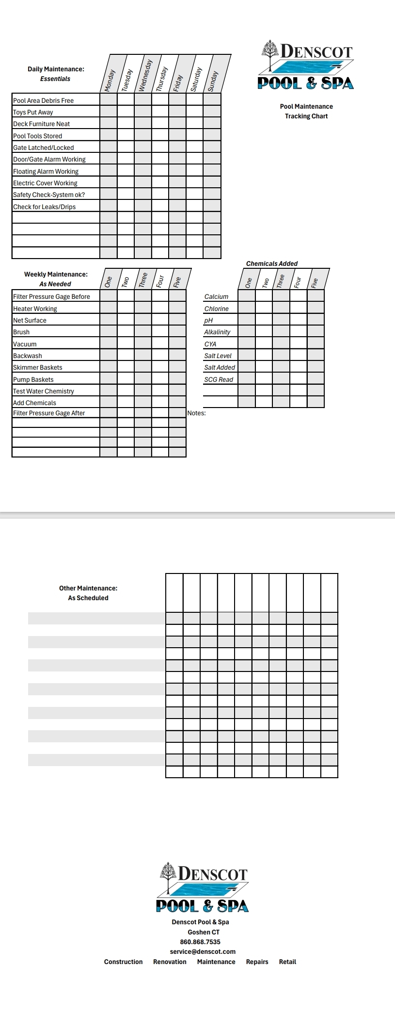 Here is a downloadable option, with a blank equipment inspection chart so you can fill it out specific to your pool. By tracking your maintenance, and scheduling your inspections, you can better spot trends, patterns, and prepare for future seasons. Each season will be smoother and more enjoyable than the last!